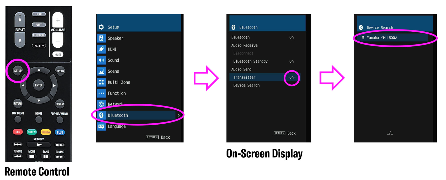 Alternatively, if you’re using a Yamaha RX-V Series or AVENTAGE AV receiver with an on-screen display, you can use the settings button on its remote control to display the setup menu on your connected TV, as shown in the illustration below. All you have to do then is scroll to the Bluetooth tab and follow the instructions to connect to your headphones.