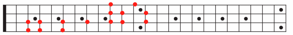 The first mode, Ionian, is simply the major scale. The illustration below shows a two-octave G major scale that puts all four strings under your fingers.