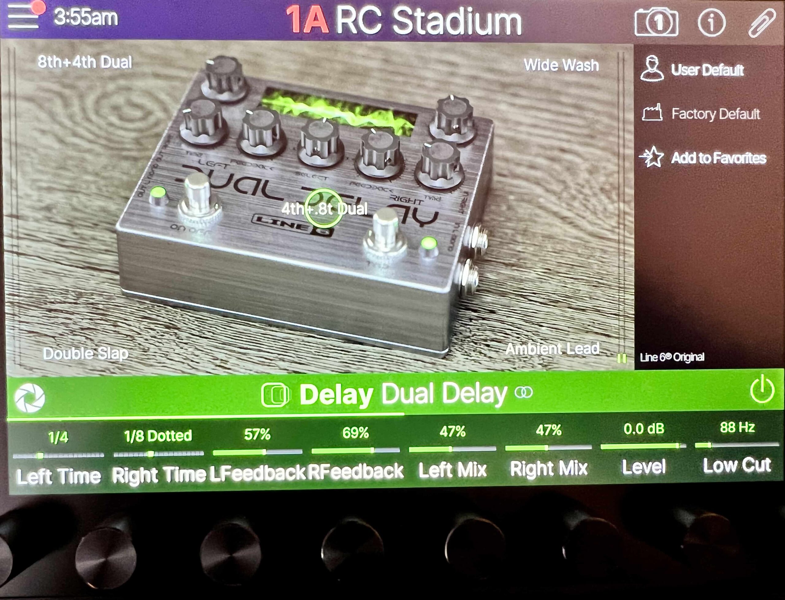 After selecting an amp, for example, you can use the Focus View feature to create the exact tone you want by sliding the center detent of the screen between each of the tonal variations shown on the four corners of the screen. This allows you to audition tonal nuances in-between any of the four suggested sounds. You’ll notice that the digital readouts above the rotary dials that control each of the amp parameters will also change with your finger locations on the screen. Absolutely amazing for dialing in sounds on the fly!