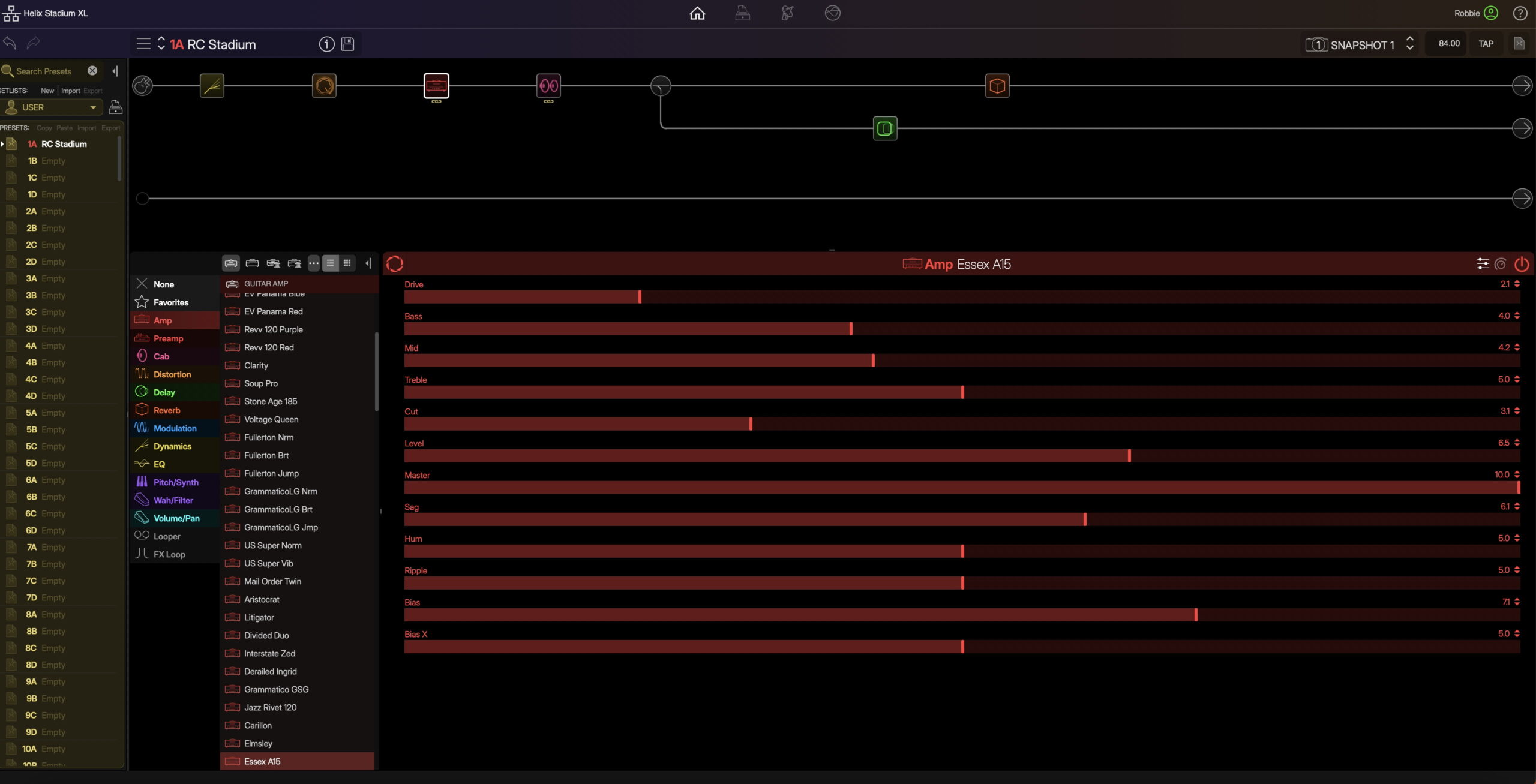 There are also ways of tweaking the overall feel of an amplifier within Helix and Helix Stadium XL. The “Sag” control, for example, can make the amp feel looser or tighter. Think of this as the responsiveness to your playing style. The rectifier tube found in some amps will create this “Sag” feeling.