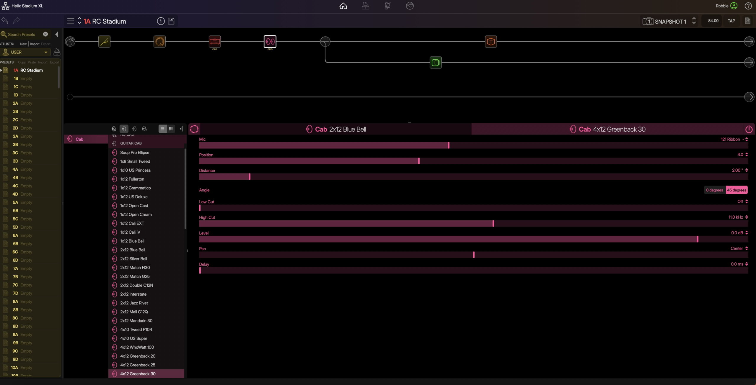 You can also choose which microphones are being used to capture the sound coming from the cabinets. Both Helix and Stadium XL offer a ton of microphone models to choose from. I suggest auditioning them all before making a decision. Common choices include a 121 ribbon microphone and an SM57 condenser mic.