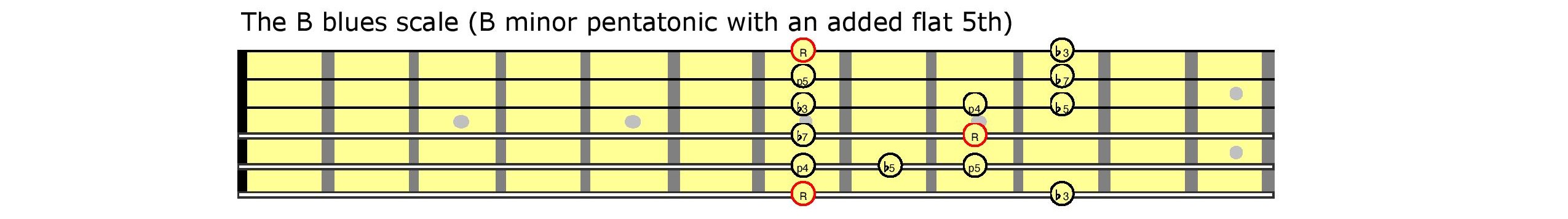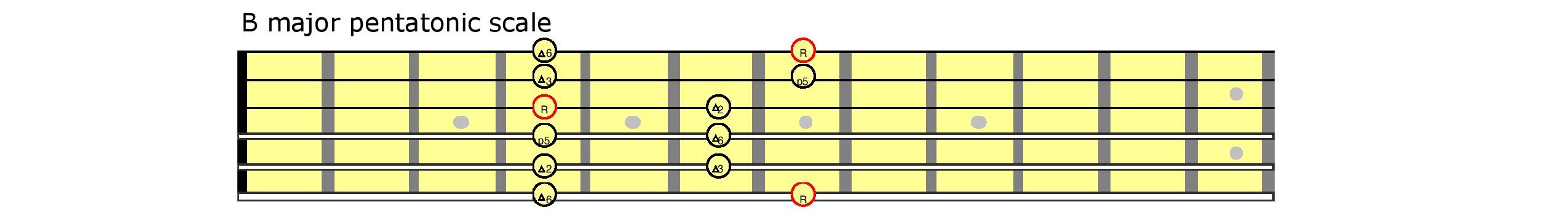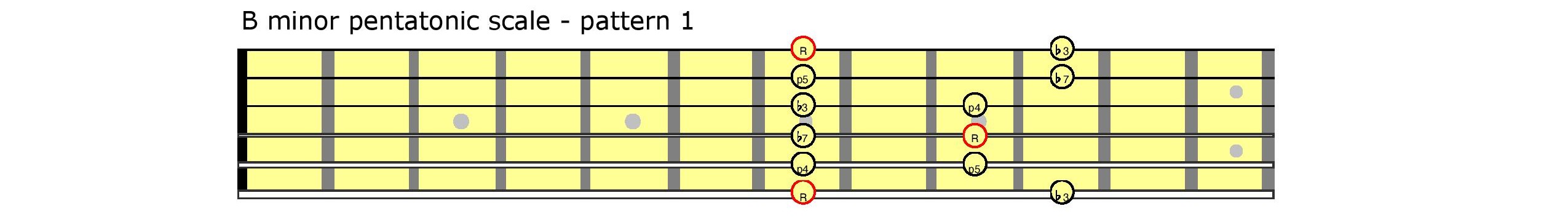 As an example, here’s pattern 1 of the B minor pentatonic scale: