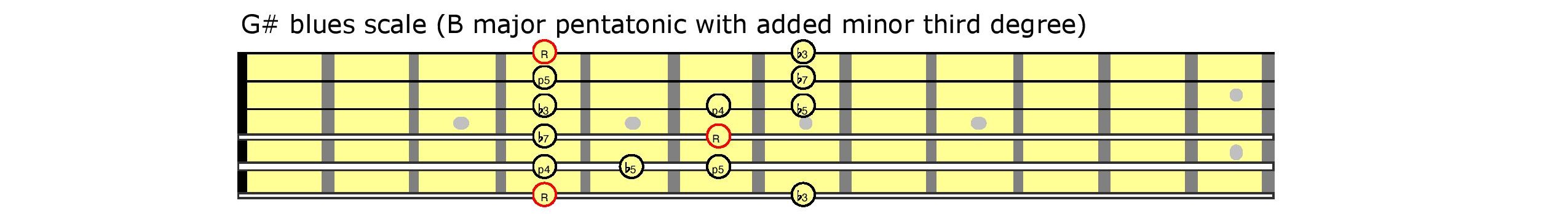 Next, take a look at these fretboard diagrams of the B minor pentatonic scale shape and the G# minor pentatonic (B major pentatonic) scale shape: