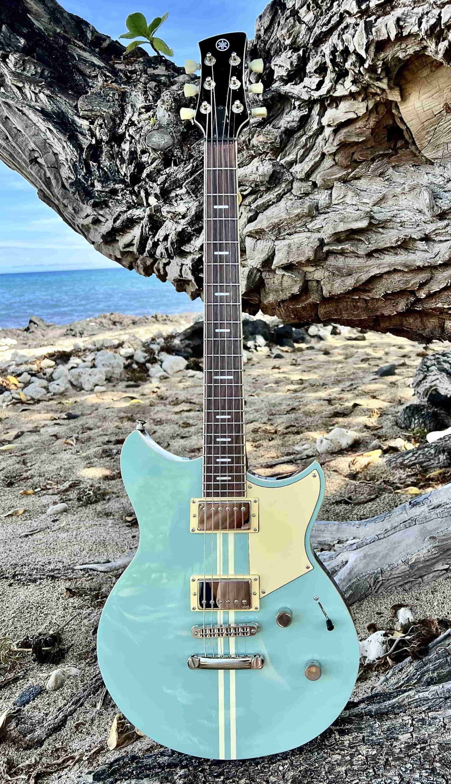 In this video, I’m playing a Yamaha Revstar Standard RSS20, which now comes in three new colors: Vintage White, Fired Red and Sonic Blue. The guitar I’m playing is a Sonic Blue model, which has stunning cream-colored cafe racer stripes on the body as well as on the scratch plate, binding and pickup mounts.